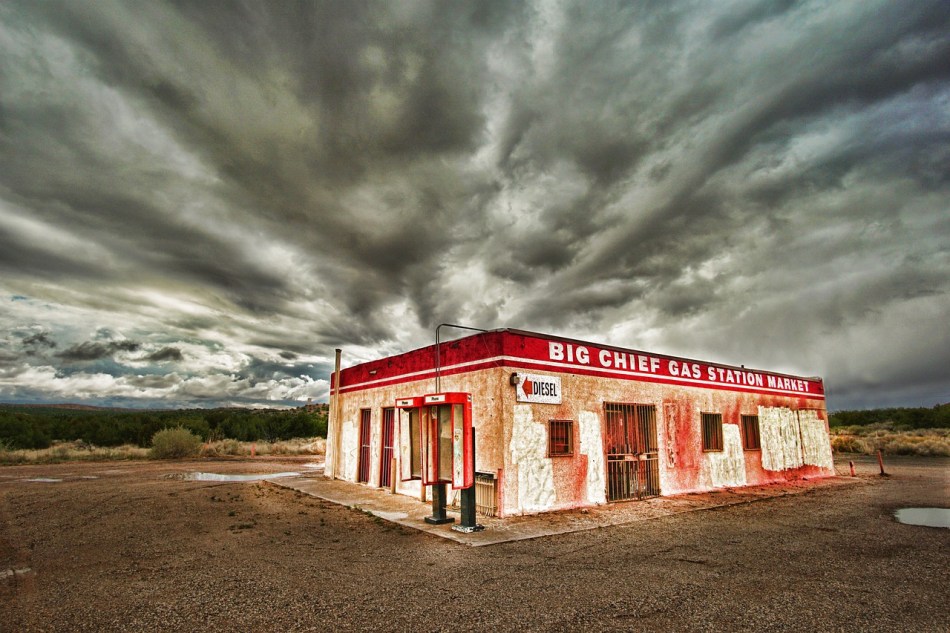 As she walked to the building, she waited for something to make a noise. There was only the eerie silence of being surrounded by empty fields, fleeting tree lines, and dark mountains at the horizon. If there were animals around, they were keeping it to themselves. She yanked open the door, partly wishing it was locked. It wasn’t. She took a deep breath in and stepped inside. The shelves were empty, and the place had been at this state for years from the look of it.